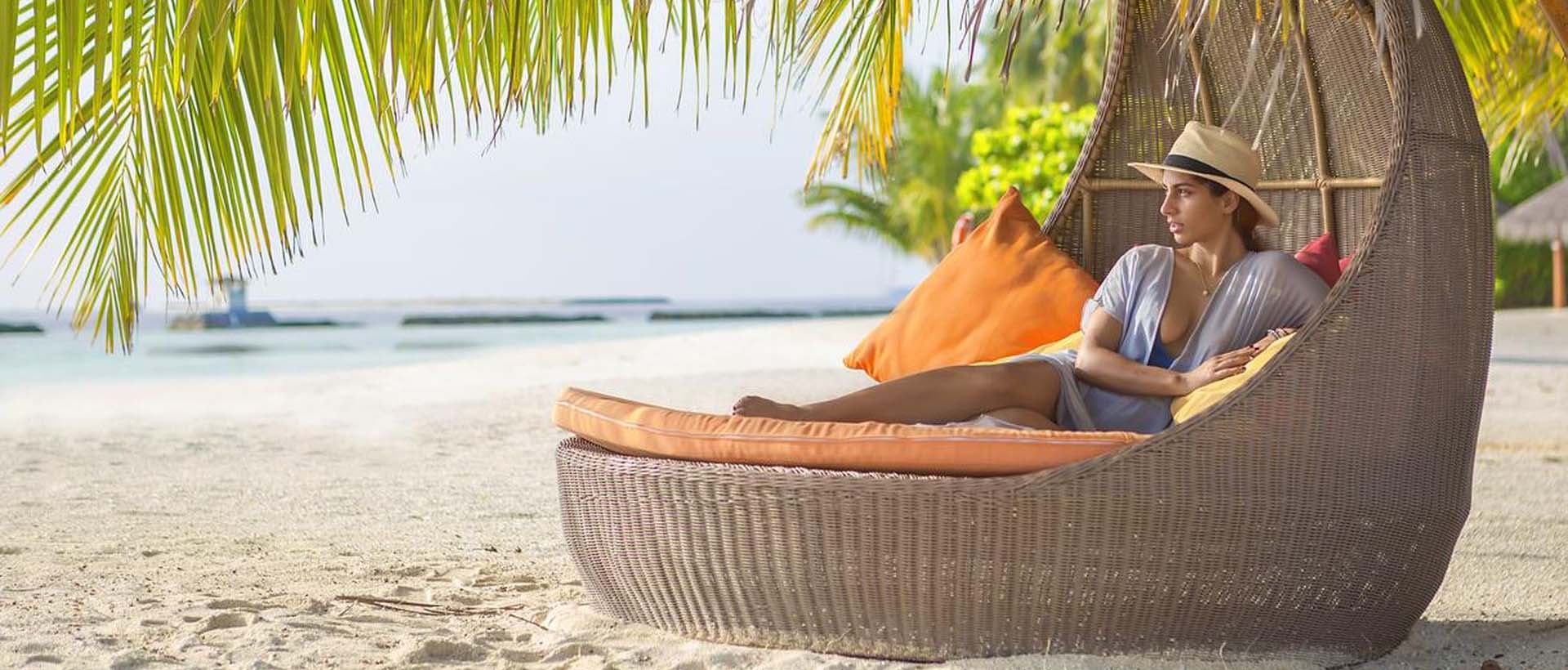 Все виллы окружены пышной растительностью и выходят окнами на живописный пляж и лагуну. Гости могут любоваться панорамным видом на океан. Белый интерьер вилл удачно дополняют теплые тропические тона, яркие подушки и софа в будуарном стиле. В распоряжении гостей встроенный шкаф, рабочая зона в углублении в стене, настенный телевизор и открытая ванная комната в мальдивском стиле с душем под открытым небом.